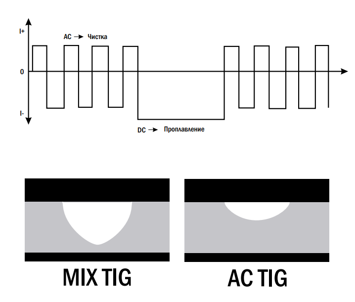 Режим сварки MIX TIG – главное преимущество инвертора TRITON ALUTIG 250P AC/DC. Используя данный режим, можно добиться идеальных сварочных параметров для работы с листовыми изделиями и цветными металлами. При сварке в режиме MIX TIG происходит разбивание оксидной пленки переменным током, далее следует цикл провара постоянным током. В процессе сварки эти циклы чередуются, что позволяет быстро очищать поверхность металла и выполнять идеально ровный сварочный шов. Оператор может самостоятельно управлять режимом MIX TIG, настраивая, как часто циклы будут чередоваться друг с другом, а также какая часть внутри цикла будет затрачиваться на провар, а какая — на удаление оксидной пленки. Благодаря этому значительно повышается скорость сварочного цикла, улучшается качество шва и снижается расход материалов.